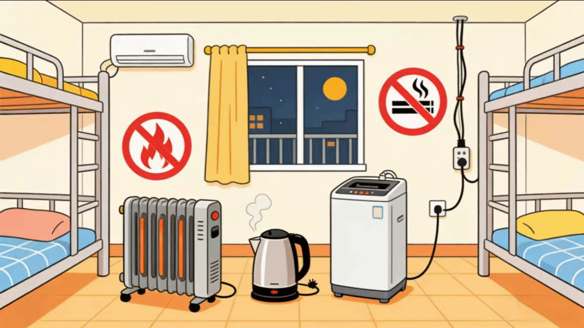 宿舍是留校学生的主要活动场所,因此维护宿舍安全是留校安全的重中之重。严禁在宿舍内使用电热毯、电炉、电水壶、电热棒等违禁电器,此类电器功率较大,极易引发电路过载、短路等问题,进而诱发火灾。同时,严禁在宿舍内存放烟花爆竹、酒精、汽油、化学品等易燃易爆或有毒有害物品,此类物品稳定性差,遇明火、高温极易发生爆炸或泄漏。此外,要坚决杜绝私拉乱接电线、网线,长时间给电子设备充电且无人看管,以及卧床吸烟、乱扔烟头、使用明火照明等危险行为。研究院将定期对留校学生宿舍进行安全检查,及时排查整改安全隐患,学生之间也应相互监督、共同提醒,携手维护宿舍整体安全环境。
